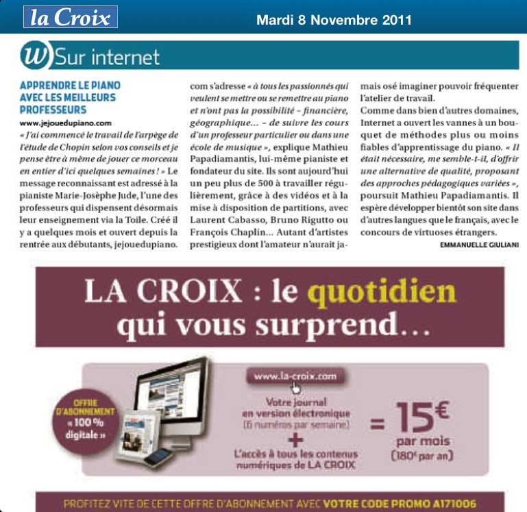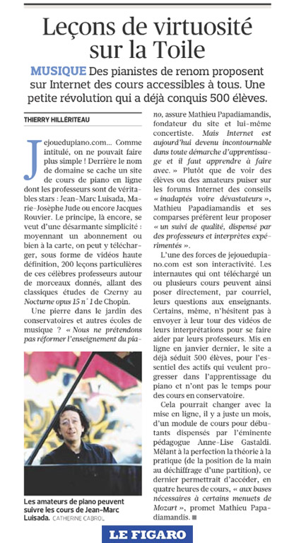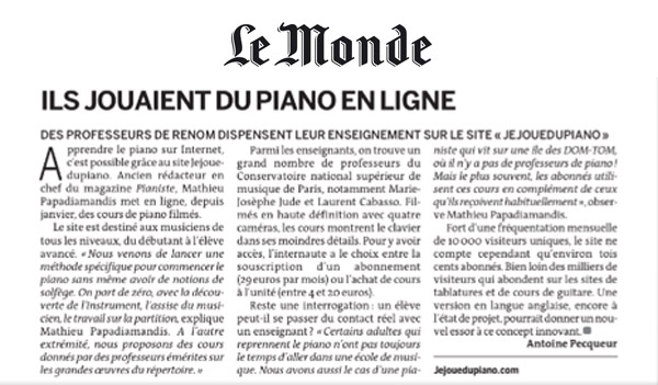 "Lean to play the piano via Internet, it's possible thanks to the website iplaythepiano.com. The former editor-in-chief of Pianiste magazine, Mathieu Papadiamandis, launched this January a series of filmed piano lessons available online. The website is intended for musicians of all levels, from beginner to advanced. We've created a specific course for starting the piano, which doesn't require any knowledge of how to read music. We start from zero, first by getting to know the instrument, the posture at the piano, and learning to read music, explains Mathieu Papadiamandis. At the other extreme, we offer lessons by acclaimed teachers on the great works of the pianistic repertoire..."